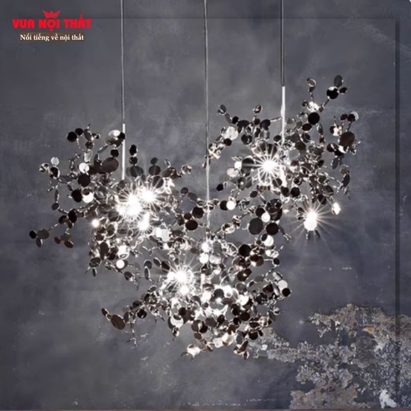 - Thiết kế chùm thả nghệ thuật: Kiểu dáng lấy cảm hứng từ các nhánh hoa kim loại tròn, sắp xếp đa hướng tạo hiệu ứng mềm mại, giúp không gian trở nên sinh động, có chiều sâu và thu hút ánh nhìn ngay từ lần đầu tiên.