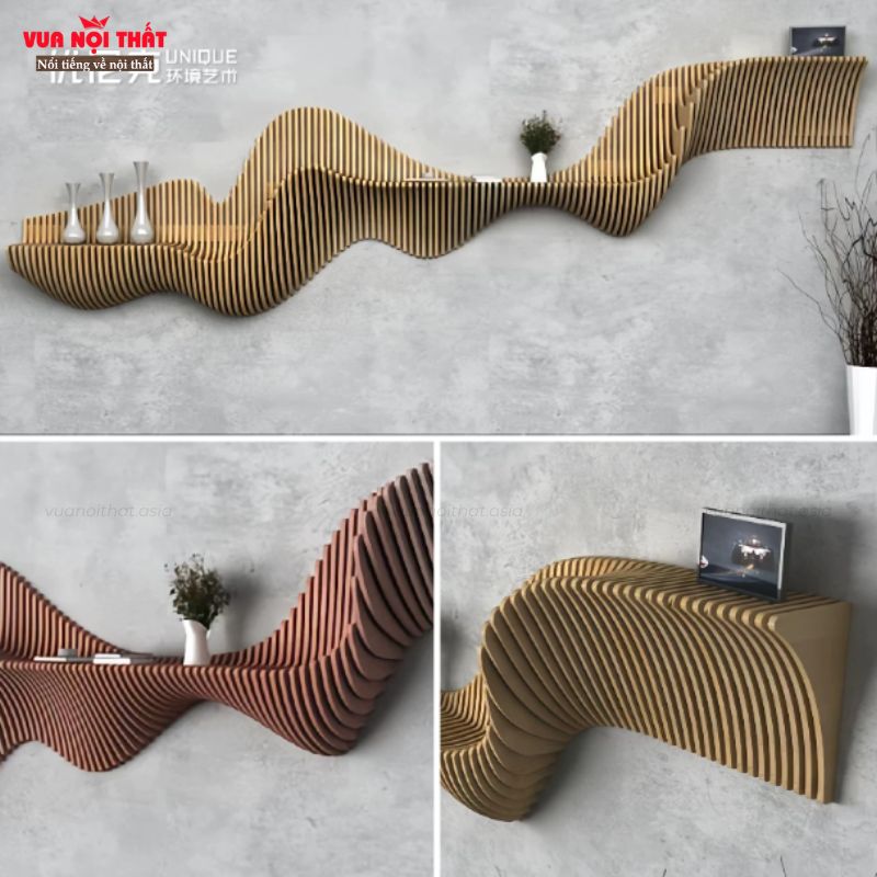 - Thiết kế lượn sóng 3D: Kiểu dáng uốn lượn mềm mại như dòng chảy tự nhiên giúp kệ decor trở nên nổi bật ngay từ cái nhìn đầu tiên.