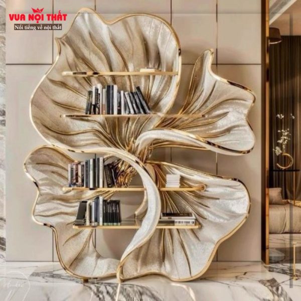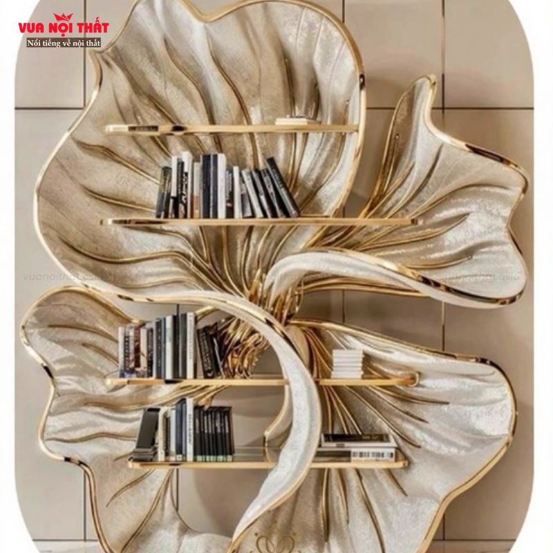 Kệ trưng bày bằng gỗ cho biệt thự cao cấp TK13 là lựa chọn hoàn hảo cho những biệt thự sang trọng, mang đến vẻ đẹp đẳng cấp và nghệ thuật cho không gian sống. Với thiết kế độc đáo lấy cảm hứng từ những cánh hoa mềm mại, kệ không chỉ là nơi trưng bày sách, đồ lưu niệm mà còn là một tác phẩm trang trí tinh tế. Chất liệu gỗ cao cấp kết hợp cùng đường sơn vàng ánh kim nổi bật giúp tổng thể trở nên sang trọng, hiện đại và cuốn hút mọi ánh nhìn. Kệ trang trí cao cấp TK13 được chế tác tỉ mỉ, đảm bảo độ bền, tính thẩm mỹ cao, phù hợp đặt tại phòng khách, phòng đọc hoặc sảnh lớn biệt thự. Nội dung bài viết dưới đây, hãy cùng Vuanoithat tìm hiểu chi tiết về kệ trưng bày bằng gỗ cho biệt thự sang trọng TK13 nhé!