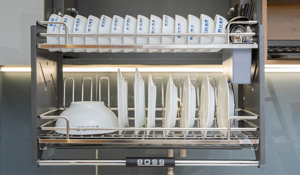 Giá bát nâng hạ là phụ kiện được lắp đặt trong khoang tủ bếp trên, có thể kéo xuống/đẩy lên linh hoạt thông qua hệ thống trợ lực. Nhờ vậy, việc lấy/cất bát đĩa, úp sấy trở nên dễ dàng, đặc biệt với người có chiều cao khiêm tốn, người lớn tuổi hoặc khi khoang bếp thiết kế cao.
