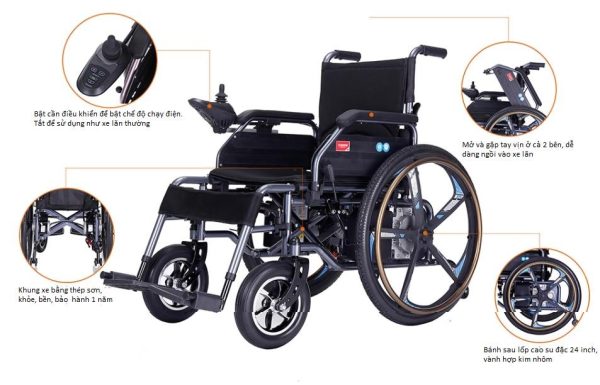 Xe còn được trang bị điều khiển từ xa, thuận tiện cho cả người dùng lẫn người chăm sóc. Với nhiều tùy chọn pin (Axit chì 12AH, Pin lithium 12AH – 30AH), đáp ứng nhu cầu sử dụng linh hoạt, thời gian vận hành lâu dài.