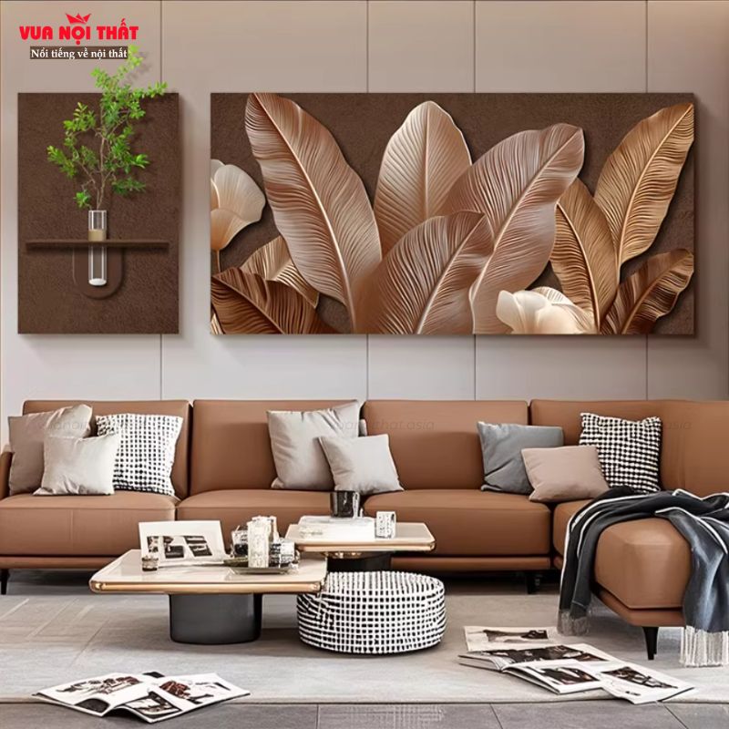 Tranh trang trí phòng khách đơn giản TT95 là lựa chọn hoàn hảo dành cho những ai yêu thích phong cách hiện đại, tinh tế. Mẫu tranh này nổi bật với thiết kế họa tiết lá nghệ thuật, phối màu nâu – kem sang trọng, dễ dàng hài hòa với nhiều không gian nội thất khác nhau. Bề mặt tranh sử dụng màng sứ bóng cao cấp, giúp tăng độ sáng, chống bám bụi và dễ dàng vệ sinh. Không chỉ mang lại vẻ đẹp thẩm mỹ, tranh decor tường phòng khách TT95 còn tạo điểm nhấn nổi bật, giúp phòng khách trở nên đẳng cấp hơn. Với đa dạng kích thước, mẫu trang decor này phù hợp cho cả không gian nhỏ lẫn rộng rãi. Nội dung bài viết dưới đây, hãy cùng Vuanoithat tìm hiểu chi tiết về tranh trang trí phòng khách đẹp TT95 nhé!