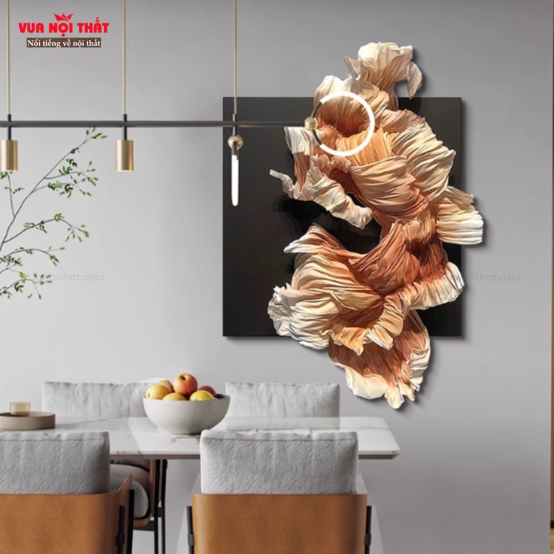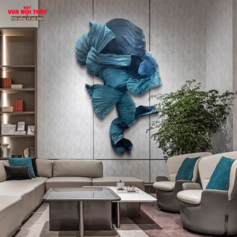 - Thiết kế nghệ thuật 3D độc đáo: Tranh được tạo hình từ những nếp vải uốn lượn mềm mại, mô phỏng hình khối tự nhiên giống như làn sóng hay cánh hoa đang chuyển động. Hiệu ứng 3D sống động giúp bức tranh trở thành điểm nhấn thu hút ánh nhìn ngay khi bước vào không gian.